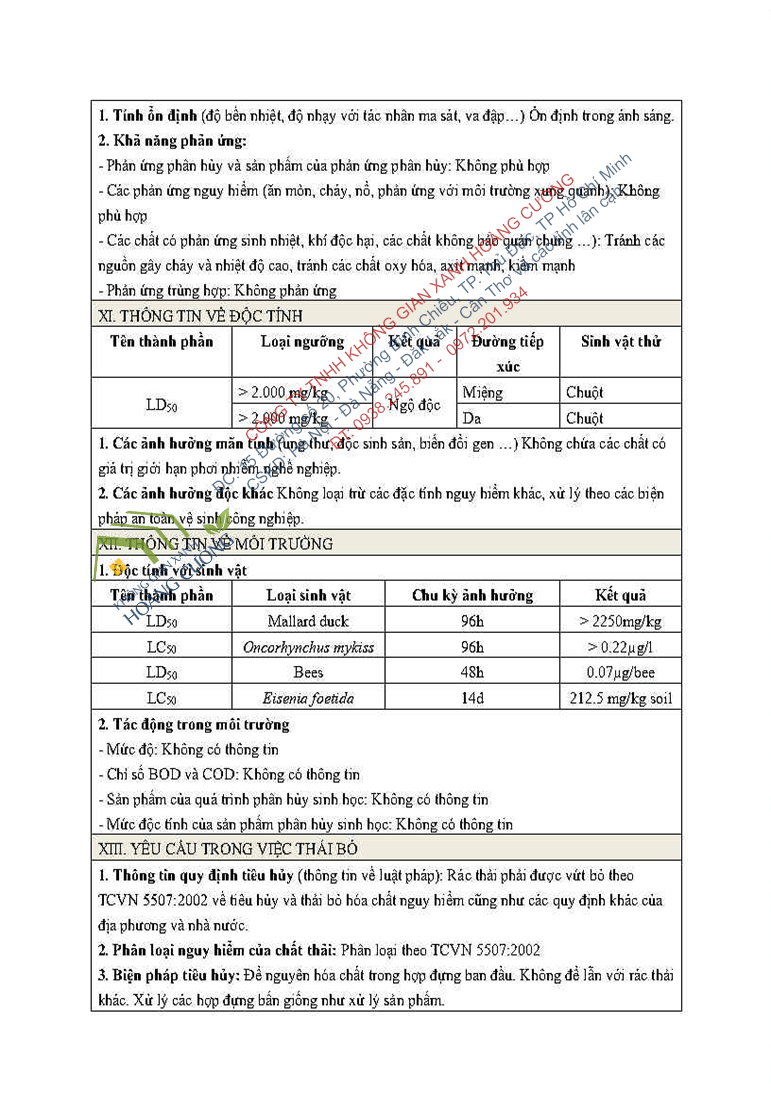 - Quy định tiêu hủy: Rác thải phải được vứt bỏ theo TCVN 5507:2002 về tiêu hủy và thải bỏ hóa chất nguy hiểm, cũng như các quy định khác của địa phương và nhà nước.