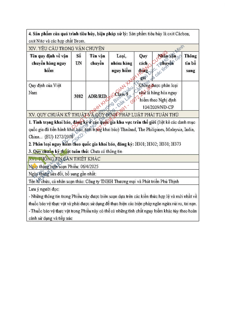 - Biện pháp tiêu hủy: Để nguyên hóa chất trong hộp đựng ban đầu. Xử lý hộp đựng bẩn giống như xử lý sản phẩm.